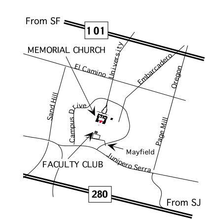 Memorial Church is located in the Main Quad of Stanford University. We recommend taking the most scenic approach to the church by parking around the Oval and walking through Memorial Court into the Main Quad. However, as parking can be limited at the Oval, we have included directions to the large parking lot in front of the Stanford Faculty Club / Tressider Student Union. In order to reach Memorial Church from the lot, walk through White Plaza past the Bookstore and fountain on the righthand side and consult campus maps as required. Be sure to allow ample time for walking (approximately 15 minutes). For written directions, see below. If you'd like a more detailed map of the Stanford campus, try this searchable campus map.